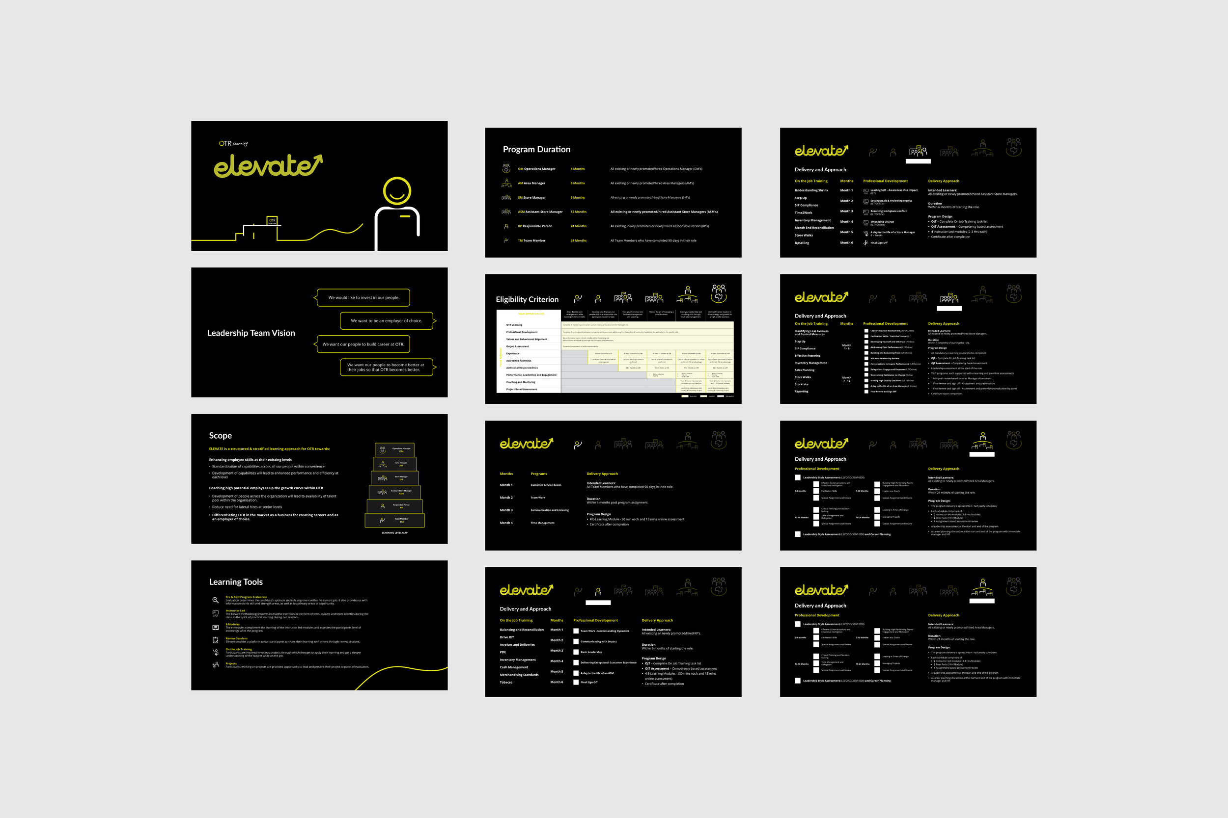 Elevate represents OTR's inaugural career progression initiative, embodying the principles of "elevate yourself, elevate your team, elevate the business". This program engages with over 3,000 employees across Australia, aiming to foster professional growth and development. The custom typographic logo was made to compliment OTR’s approachable and clean branding.